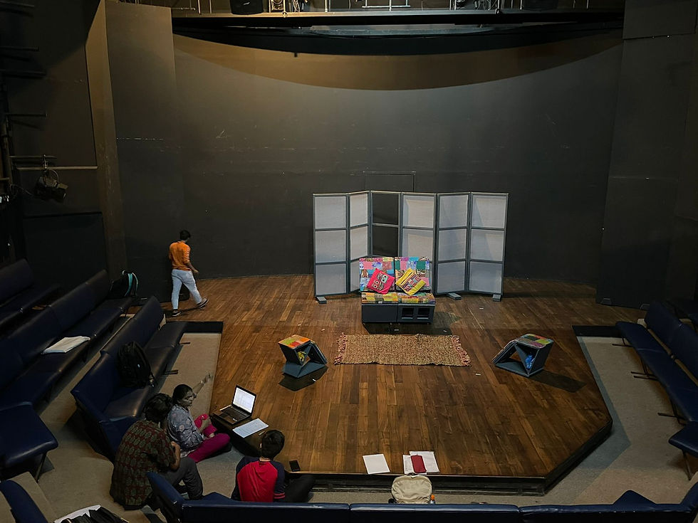 A collapsible tri-fold screen made from recycled timber and translucent fabric introduced a poetic layer to the set. With lighting, it transformed into a canvas of silhouettes and shifting shadows, echoing the play’s emotional transition